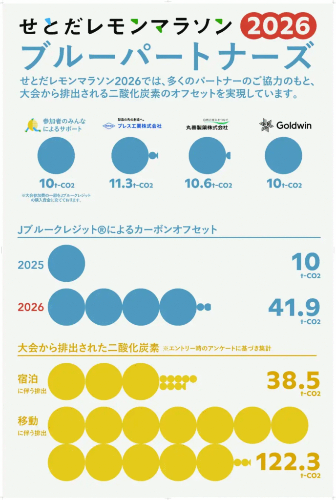 広島県尾道市瀬戸田町で2026年2月22日に開催される「せとだレモンマラソン2026」において、地元由来のブルーカーボンを活用したカーボンオフセットが実施される。