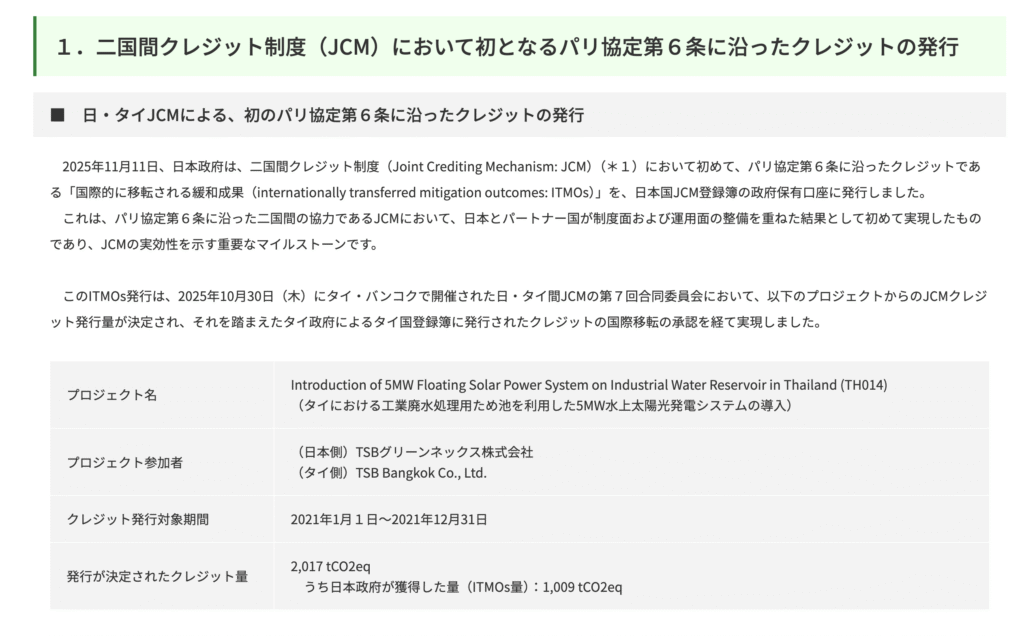 特筆すべきは、COP30会期中の2025年11月11日、タイとの間でJCMとして初となる、パリ協定6条クレジット(ITMOs)が発行されたことである。