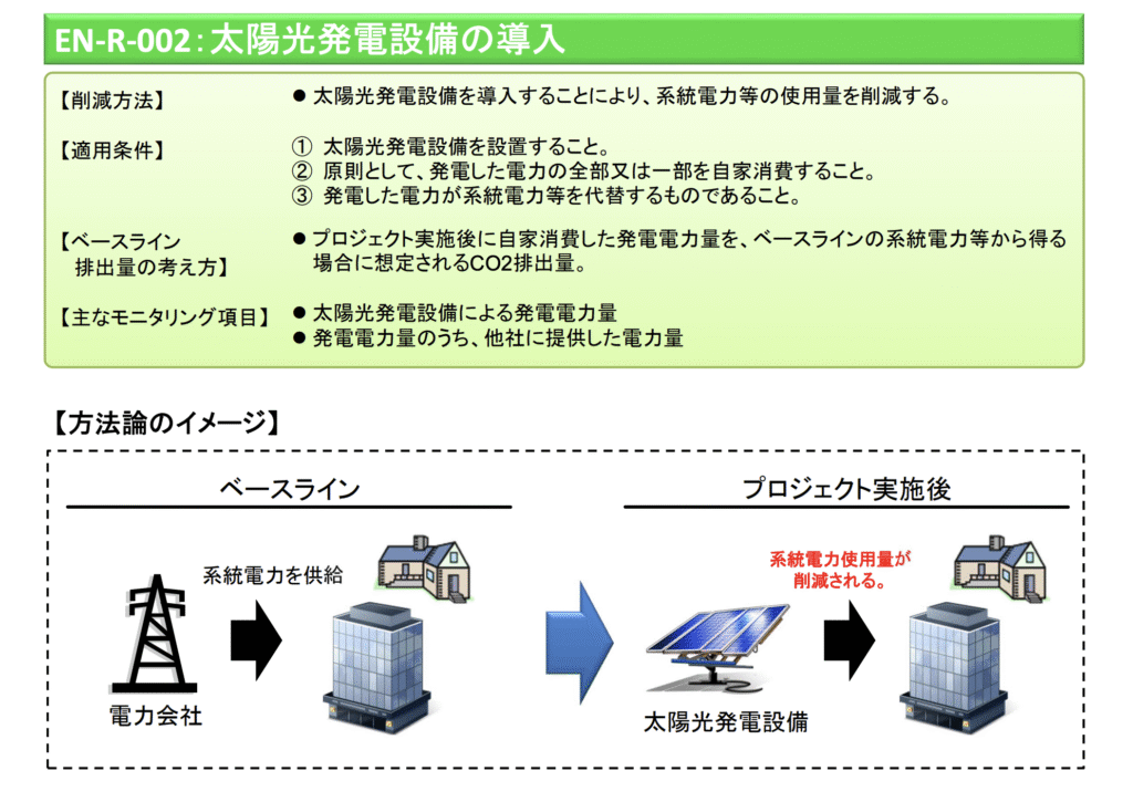 J-クレジットには技術分野ごとに方法論が整備され、適用条件・算定式・モニタリング項目が定義されている。ここでは、代表例として、太陽光(EN-R-002)に絞って解説する。