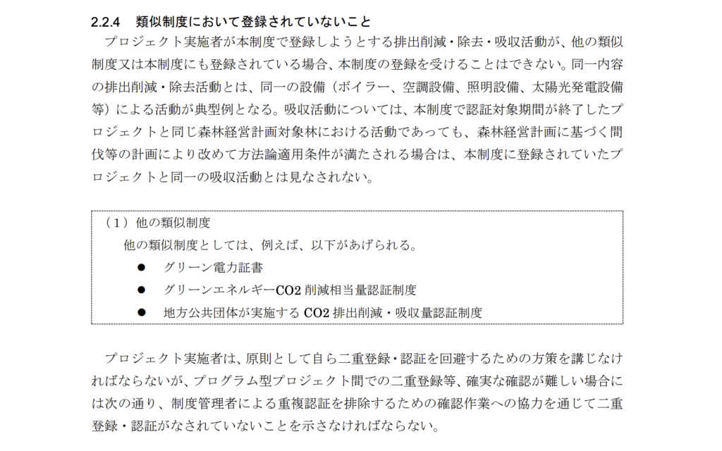 J-クレジットの実施規程には、他制度との二重認証・二重主張の禁止が明記されており、重複が疑われる期間は認証そのものができない仕組みになっている。