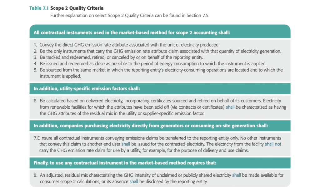 さらに、需要家(会計)側にはGHGプロトコルScope2ガイダンスが存在し、マーケット基準(market-based)方式で用いる証書や契約は重複主張を生まない品質基準を満たす必要がある。