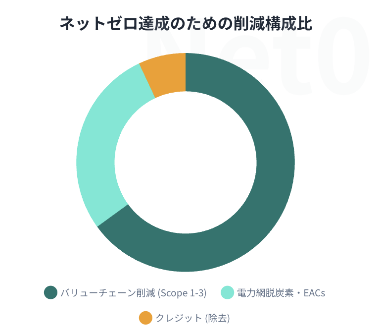 企業はネットゼロ目標達成に必要な削減量のうち、平均して約3分の2を自社運営やバリューチェーン内での削減から、28%を電力網の脱炭素化やEACsから捻出することを想定している。残りの7%については、残留排出量を相殺するためのカーボン除去(Carbon Removals)に頼る計画である。
