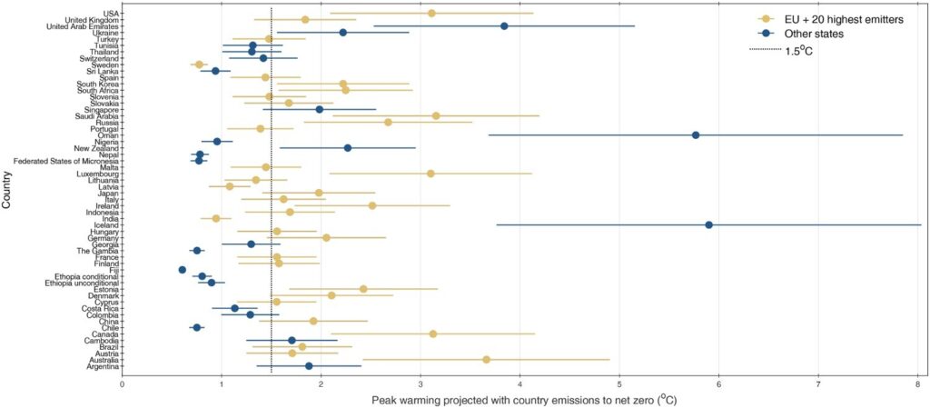 点は各国の排出経路に基づく推定ピーク温度を示し、縦の誤差線は不確実性の範囲を示す。破線は1.5°Cライン。主要排出国の多くがこれを上回っている。