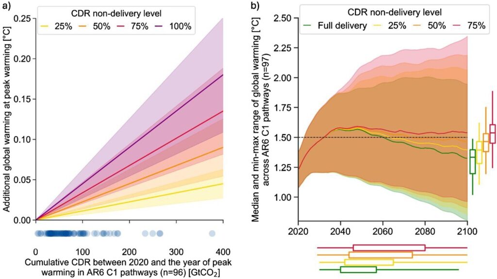 同研究は、もし各国が計画どおりのCDRを実施できなかった場合、追加的な温暖化効果が生じ、気温上昇が1.5度以内に戻らない可能性があると分析する。